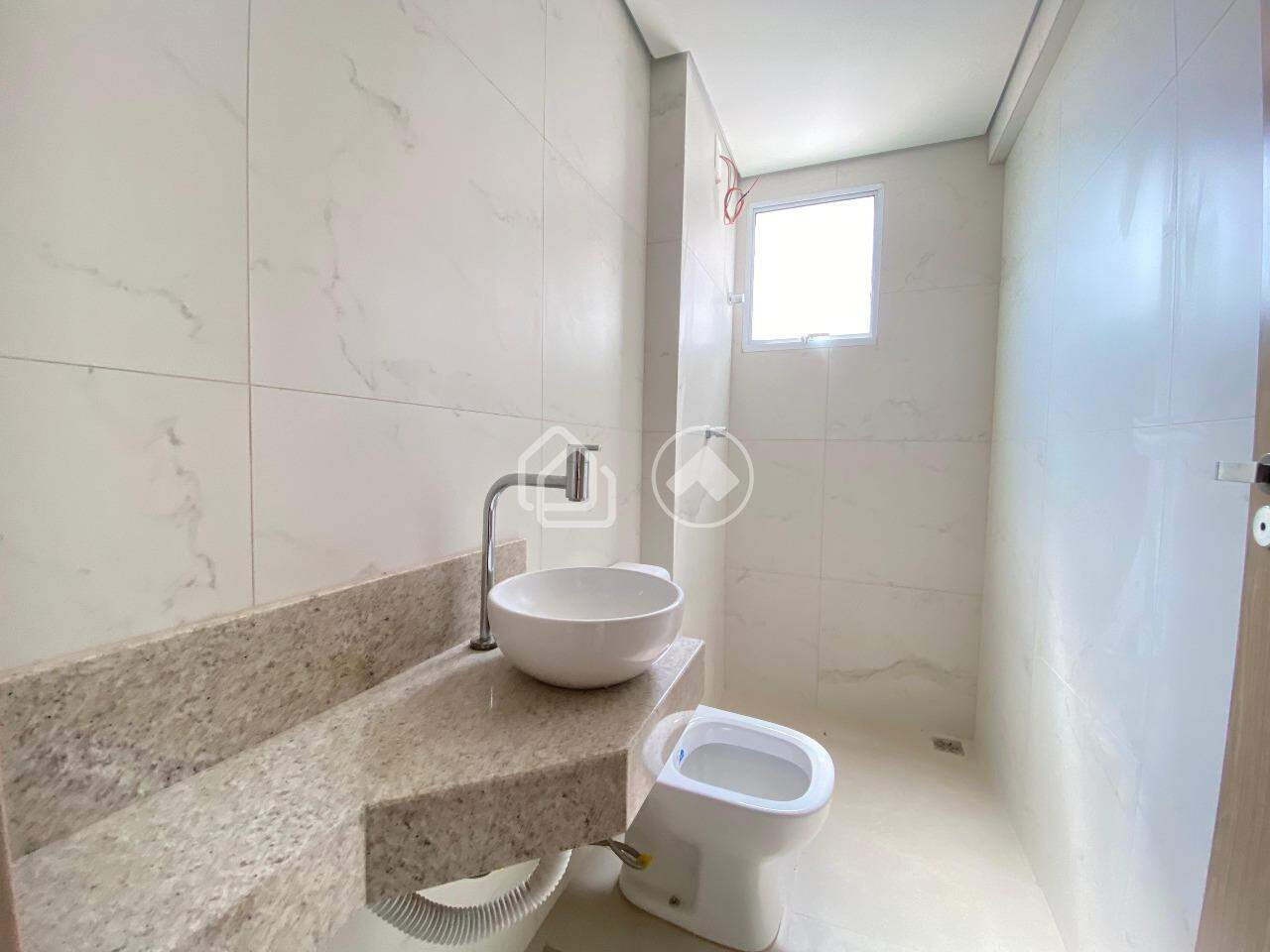 Suíte com bancada em granito e piso em porcelanato